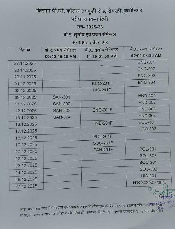 बी. ए. तृतीय एवं पंचम सेमेस्टर ( संस्थागत) बैक पेपर परीक्षा की परीक्षा सारणी दिनांक 24/11/2025